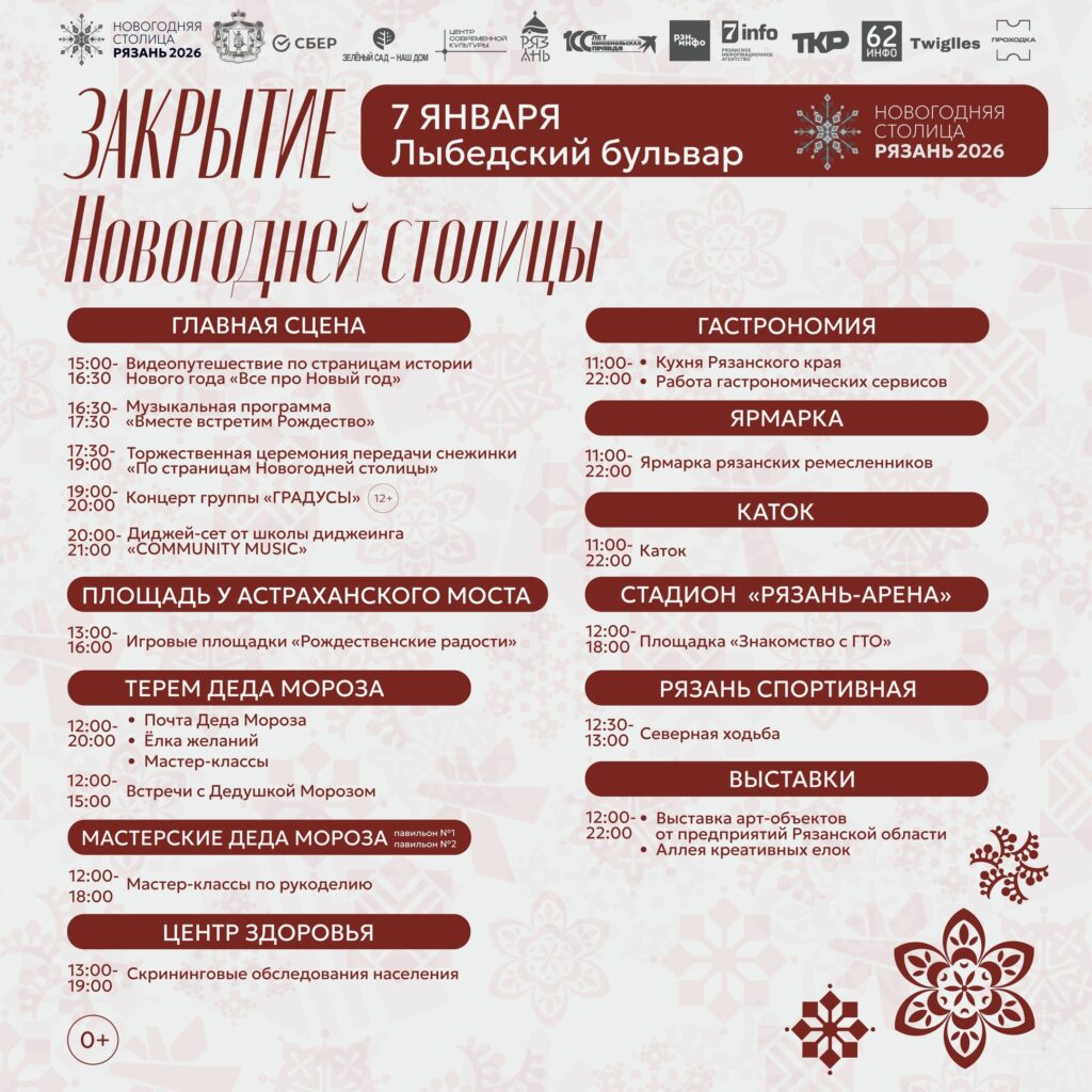7 января в Рязани на Лыбедском бульваре пройдёт закрытие Новогодней столицы России 2026 – это уникальное событие, которое позволит окунуться в атмосферу праздника и насладиться разнообразием культурных и развлекательных мероприятий. Это отличная возможность провести время всей семьей, поучаствовать в играх, познакомиться с традициями региона и насладиться концертами известных исполнителей.