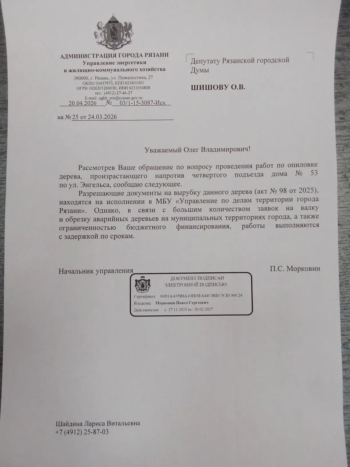Администрация города отреагировала на запрос, сообщив, что разрешительные документы на вырубку дерева находятся на исполнении в МБУ «Управление по делам территории города Рязани». Однако, в связи с большим количеством заявок на валку и обрезку аварийных деревьев, а также ограниченным бюджетным финансированием, работы выполняются с задержкой.