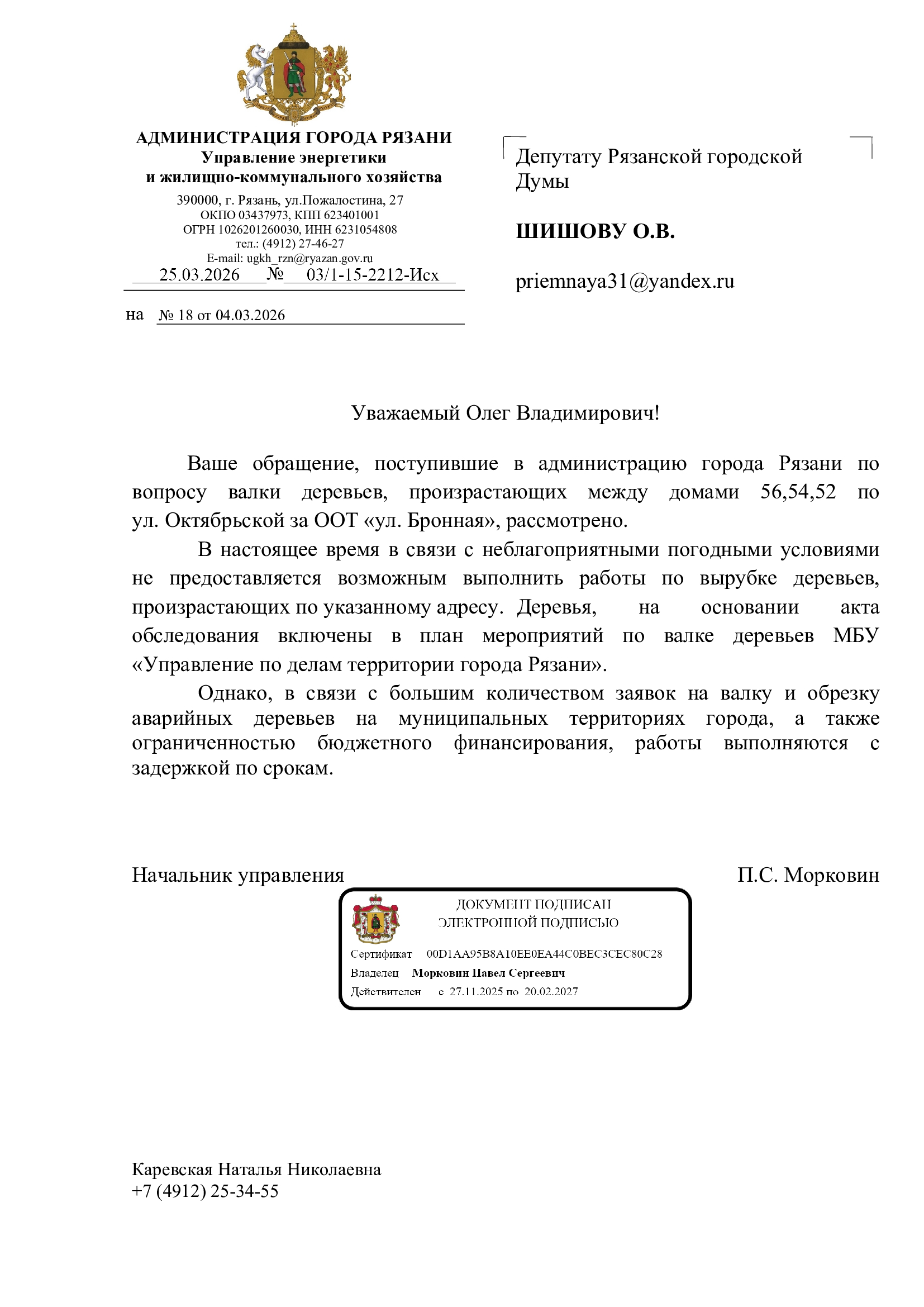 В связи с угрозой для жизни и здоровья, жители обратились в приёмную депутата Олега Шишова с просьбой о содействии. В результате был направлен официальный депутатский запрос в администрацию Рязани с требованием организовать работы по опиловке указанных деревьев.