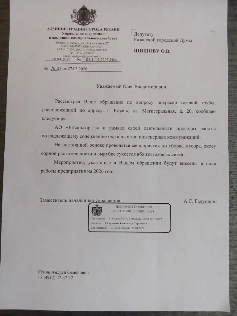 И вот пришел официальный ответ, в котором администрация Рязани обещает привести в порядок газопровод в Приокском. Чиновники сообщают, что покраска наружного газопровода по адресу: улица Магистральная, дом 20 включена в план работ на 2026 год. Это означает, что в ближайшее время объект будет приведён в надлежащее санитарное и техническое состояние.