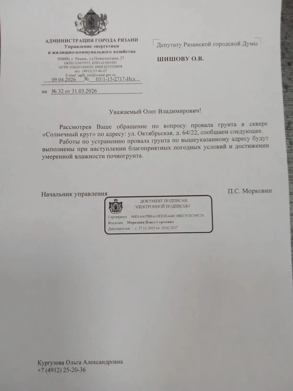 На депутатский запрос уже поступил ответ от администрации Рязани, которая обещает восстановить сквер «Солнечный круг». В официальном письме подтверждается, что работы по восстановлению грунта в сквере «Солнечный круг» будут проведены. Это решение положительно скажется на качестве жизни в городе и создаст комфортные условия для отдыха.