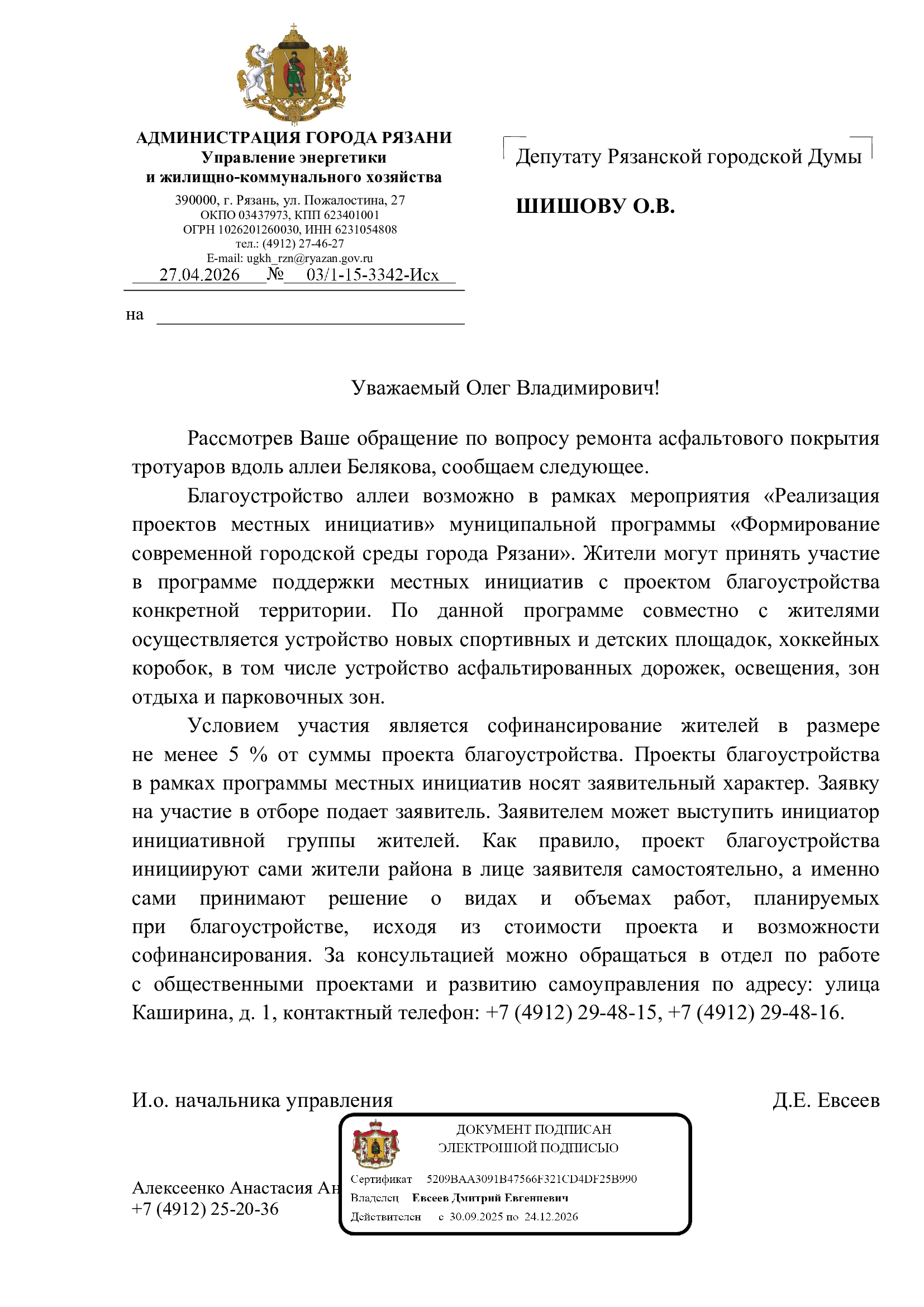 Несмотря на многочисленные обращения жителей в различные инстанции с просьбой о помощи, они получают лишь формальные отписки. Рязанцы обратились за содействием в приёмную депутата Олега Шишова. Депутат отреагировал на обращение граждан и направил официальный запрос в администрацию города Рязани с просьбой включить в план мероприятий на 2026 год ремонт асфальтового покрытия тротуаров по улице Белякова.