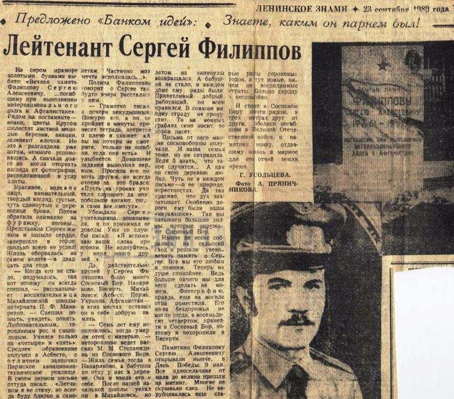 Куда бы он ни приехал, его встречали как родного, дорогого человека. Никогда не унывающий, без приглашения сразу принимался за любую работу. Во время каникул мог запросто приехать к учителям в Михайловске и Асбесте, они часто были для него первыми советчиками. Но больше любил он Сосновый Бор, где знал всех и где о нём знали всё. О печалях не рассказывал, а радостью делился со всеми. Получив лейтенантское звание, прошёл по всей деревне, отплясывая вприсядку под гармошку», – из воспоминаний сестры А.А. Завьяловой (Филипповой).