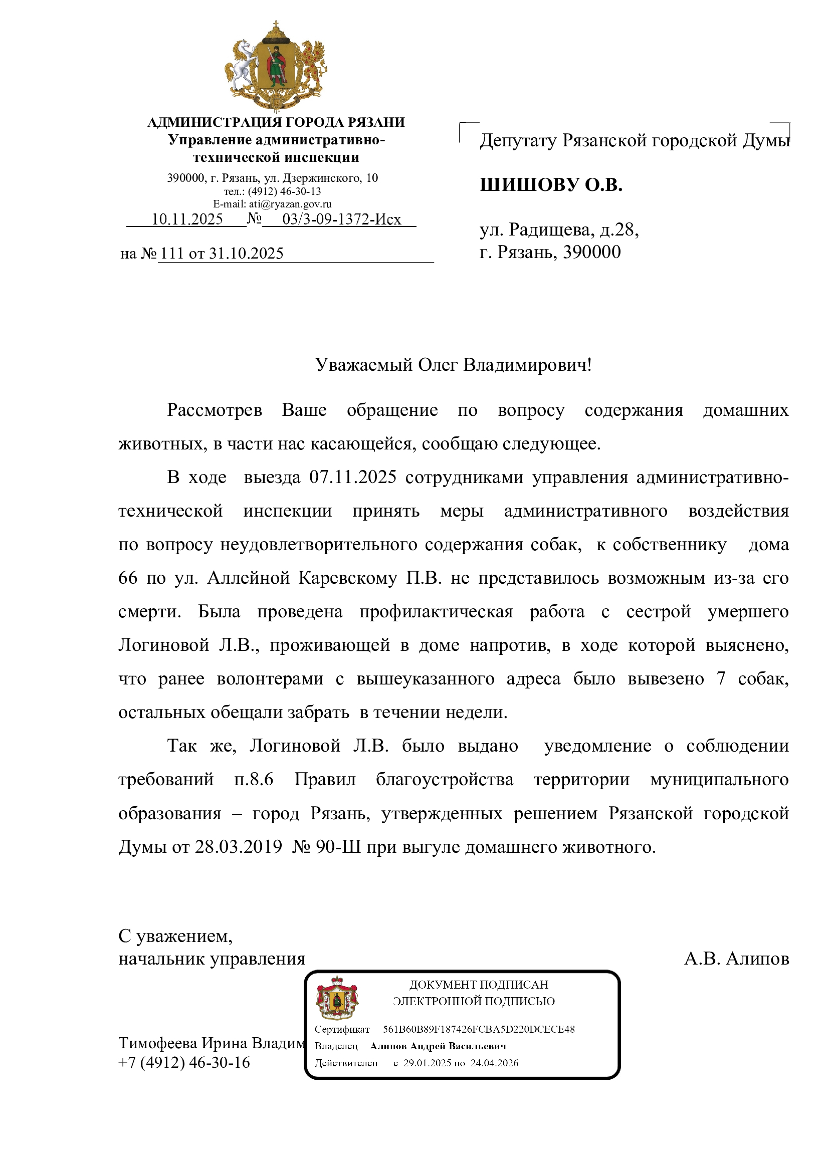 Администрация Рязани ответила: «Рассмотрев Ваше обращение по вопросу содержания домашних животных, в части нас касающейся, сообщаю следующее. В ходе выезда 07.11.2025 сотрудниками управления административно-технической инспекции принять меры административного воздействия по вопросу неудовлетворительного содержания собак, к собственнику дома 66 по ул. Аллейной Каревскому П.В. не представилось возможным из-за его смерти.
