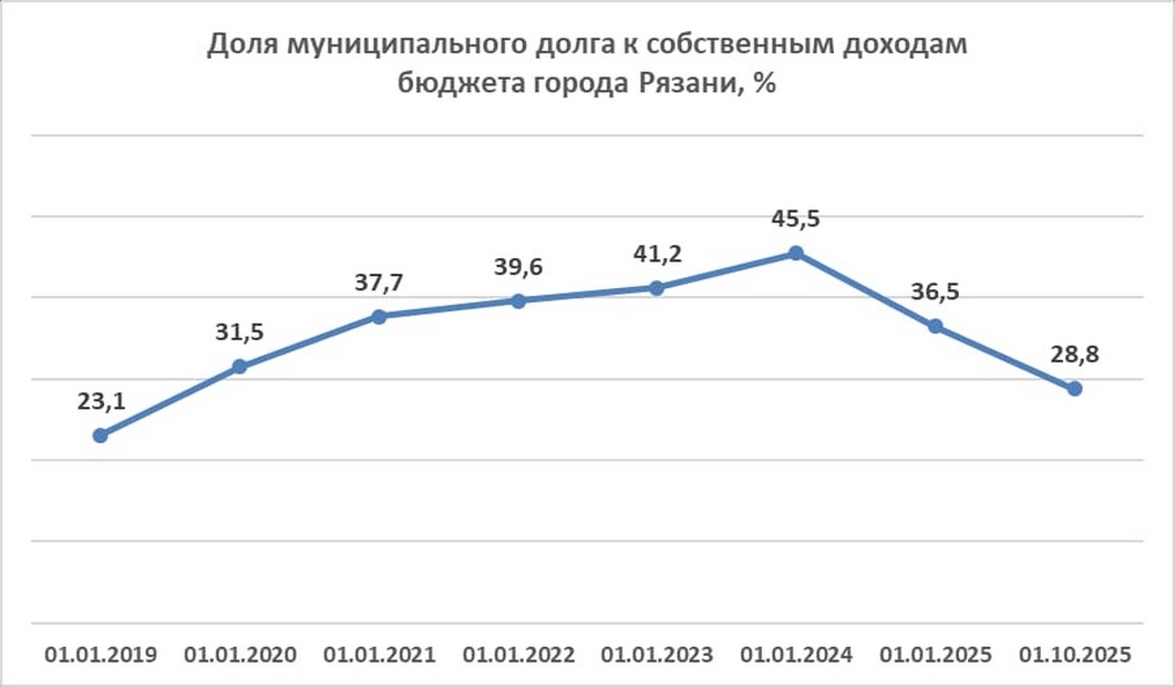 На 1 октября 2025 года долг Рязани сократился на 652 миллиона рублей, что стало значительным достижением для муниципалитета. Если на 1 января 2025 года долговые обязательства города составляли 36,5% от собственных доходов бюджета, то к осени 2025 года этот показатель снизился до 28,8%. Рязань уверенно занимает место среди семи лучших городов Центрального федерального округа с наименьшим уровнем муниципального долга.