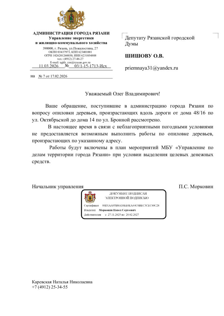 И вот пришел ответ ведомства, больше похожий на отписку, в котором сообщается, что работы по опиловке деревьев будут включены в план мероприятий при условии выделения денег. Похоже, мэрия Рязани не торопится опиливать аварийные деревья.