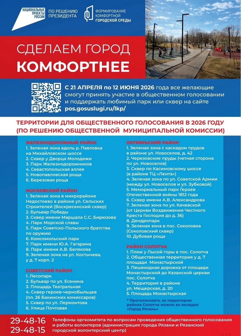 Голосование проходит в рамках федеральной программы «Формирование комфортной городской среды» национального проекта «Инфраструктура для жизни». В этом году жителям Рязани предложено 36 общественных территорий – список сформирован по предложениям горожан и решению муниципальной комиссии.