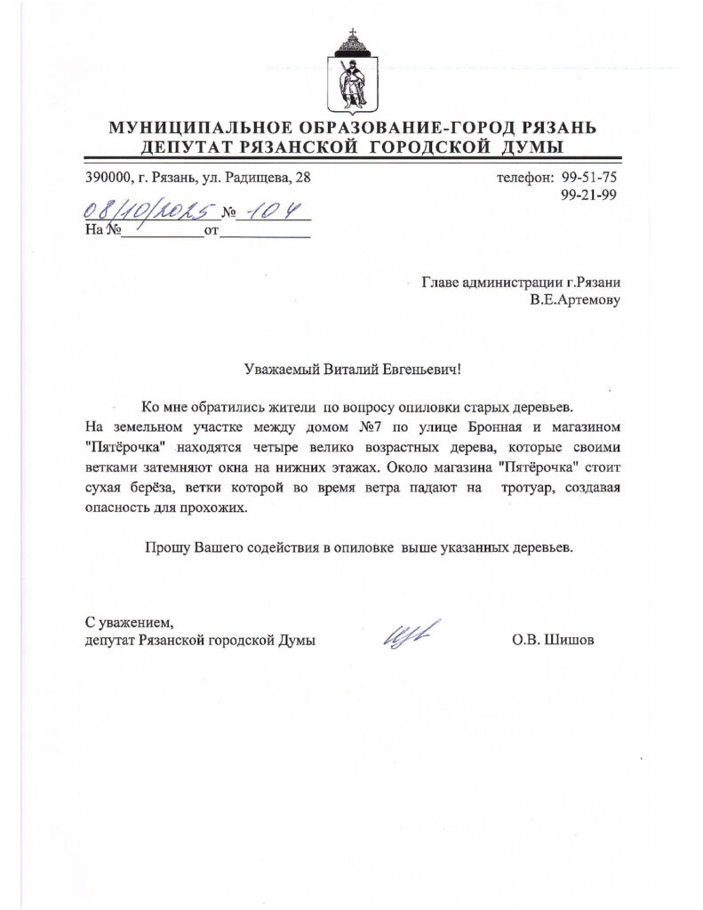 Жители Рязани обратились в приемную депутата с просьбой о помощи. В ответ на их обращение Шишов направил депутатский запрос в администрацию города с требованием провести обследование территории, осуществить опиловку деревьев и вернуть солнечное освещение в квартиры жильцов.