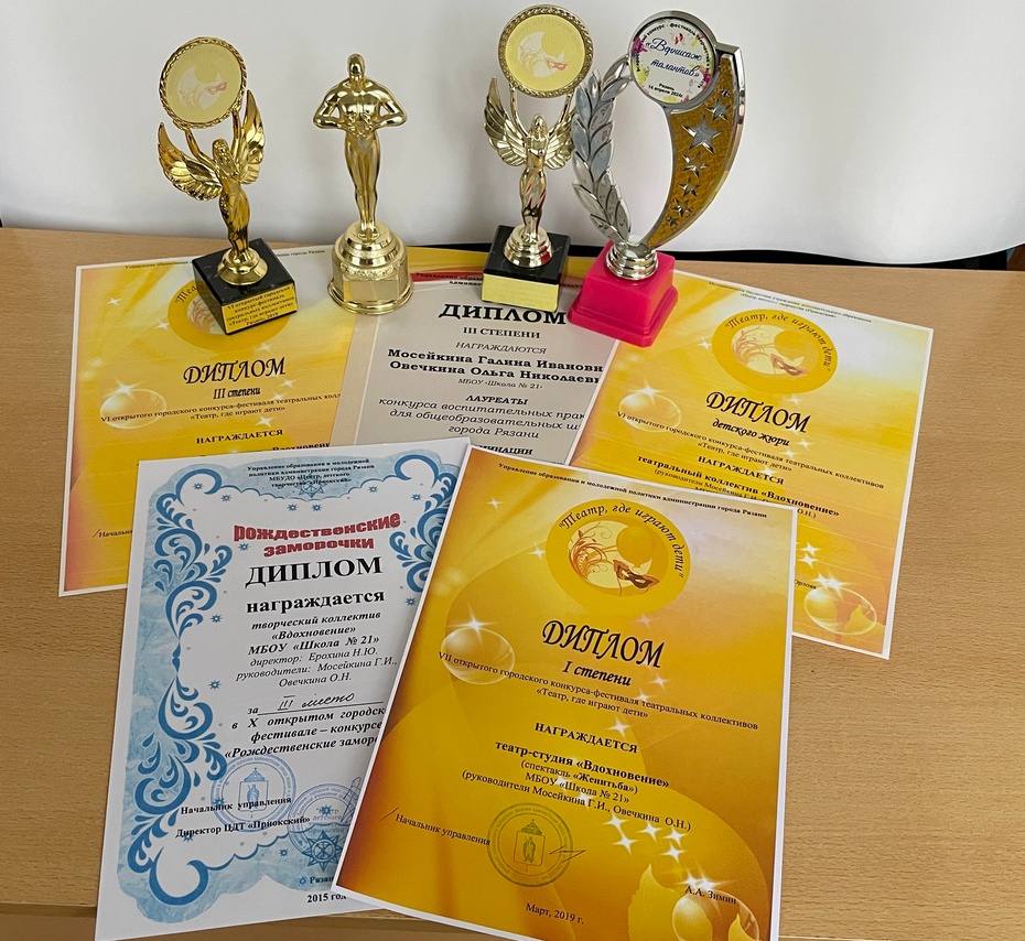 Весь творческий коллектив театра-студии «Вдохновение» благодарит директора школы Наталью Юрьевну Ерохину за инициативу и вклад в создание школьного театра: «Благодаря вашему энтузиазму и поддержке учащиеся школы № 21 г. Рязани получили уникальную возможность раскрыть свои таланты, развить творческие способности и научиться командной работе.