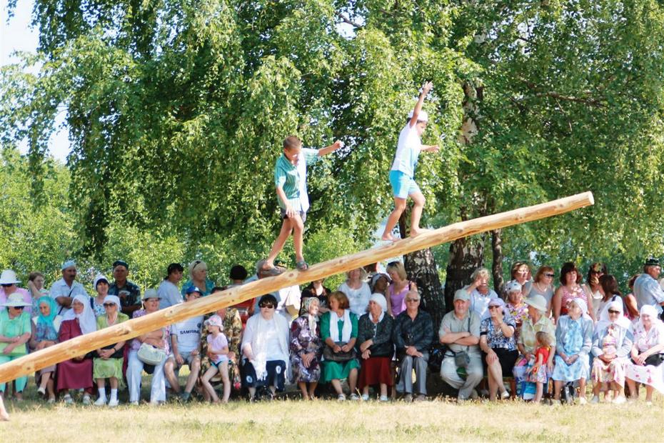 Игры на празднике были разные: молодёжь бегала наперегонки на три версты, в мешках бегали, с ложкой во рту, а в ложке яйцо. Залезали на высокий гладкий столб, а вверху подвязан подарок. Или двое на горизонтальном бревне сбивали друг дружку с бревна мешками, набитыми сеном и другие игры.