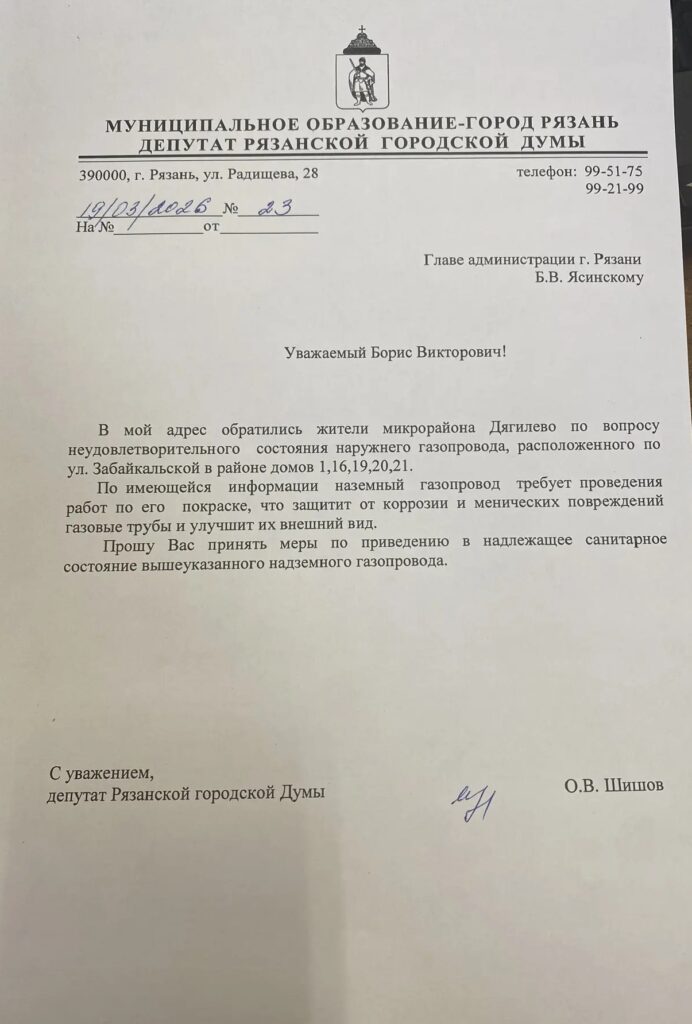 Жители микрорайона Дягилево в Рязани выражают серьёзную обеспокоенность неудовлетворительным состоянием наружного газопровода на улице Забайкальской, в районе домов №1, 16, 19, 20 и 21. Надземный газопровод давно нуждается в покраске, которая необходима для защиты труб от коррозии и механических повреждений, а также для улучшения их внешнего вида. Состояние этих газовых труб вызывает серьёзное беспокойство у жителей.