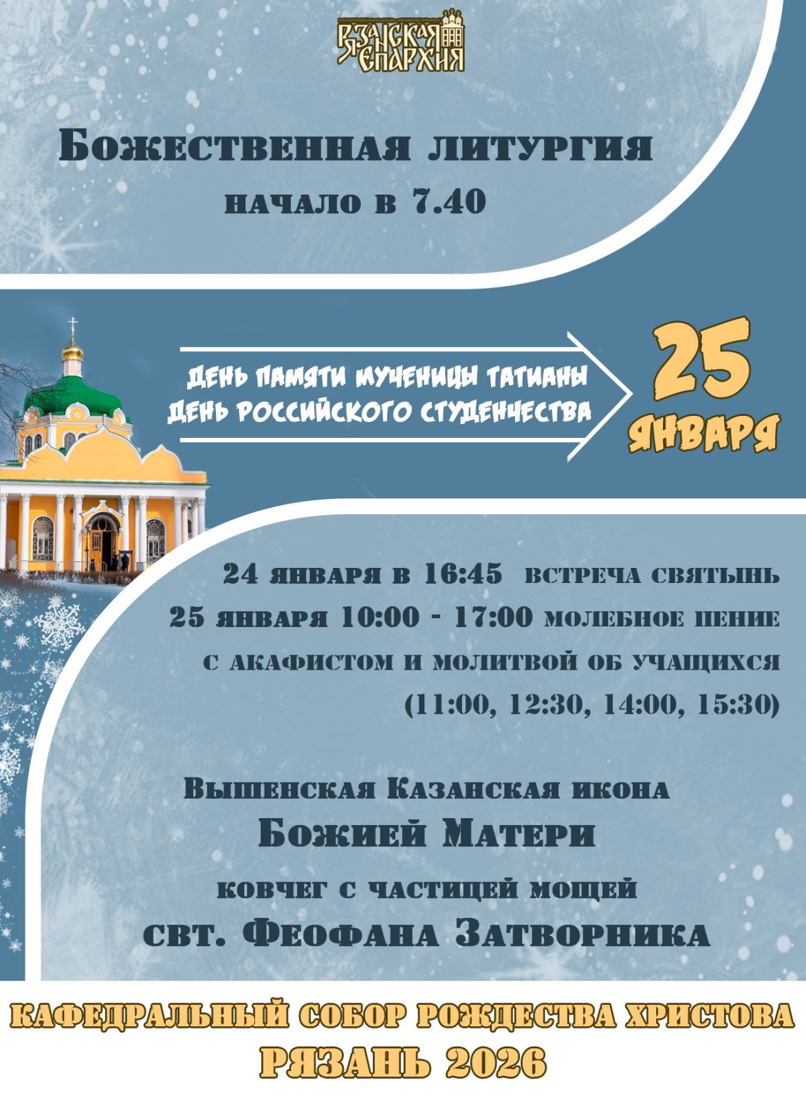 Но не только студенты смогут разделить радость праздника в этот день. Кафедраральный собор Рождества Христова приглашает всех желающих на особое торжественное богослужение, которое возглавит Его Высокопреосвященство, Митрополит Рязанский и Михайловский Марк. Начало службы запланировано на 7:40 утра, что позволит каждому прийти и помолиться вместе с единоверцами.