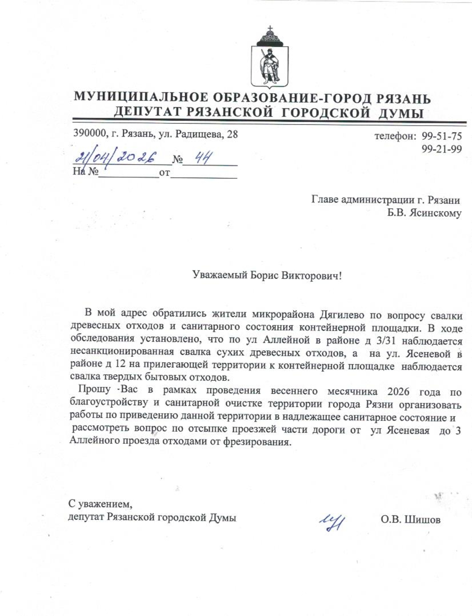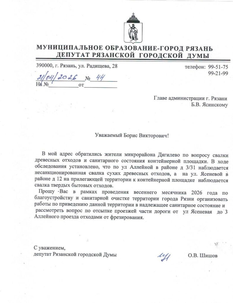 Жители улицы Аллейной обратились за помощью к депутату Олегу Шишову. По их просьбе был направлен депутатский запрос в администрацию города Рязани. В документе содержится просьба организовать работы по приведению данной территории в надлежащее санитарное состояние в рамках весеннего месячника 2026 года по благоустройству и санитарной очистке города.