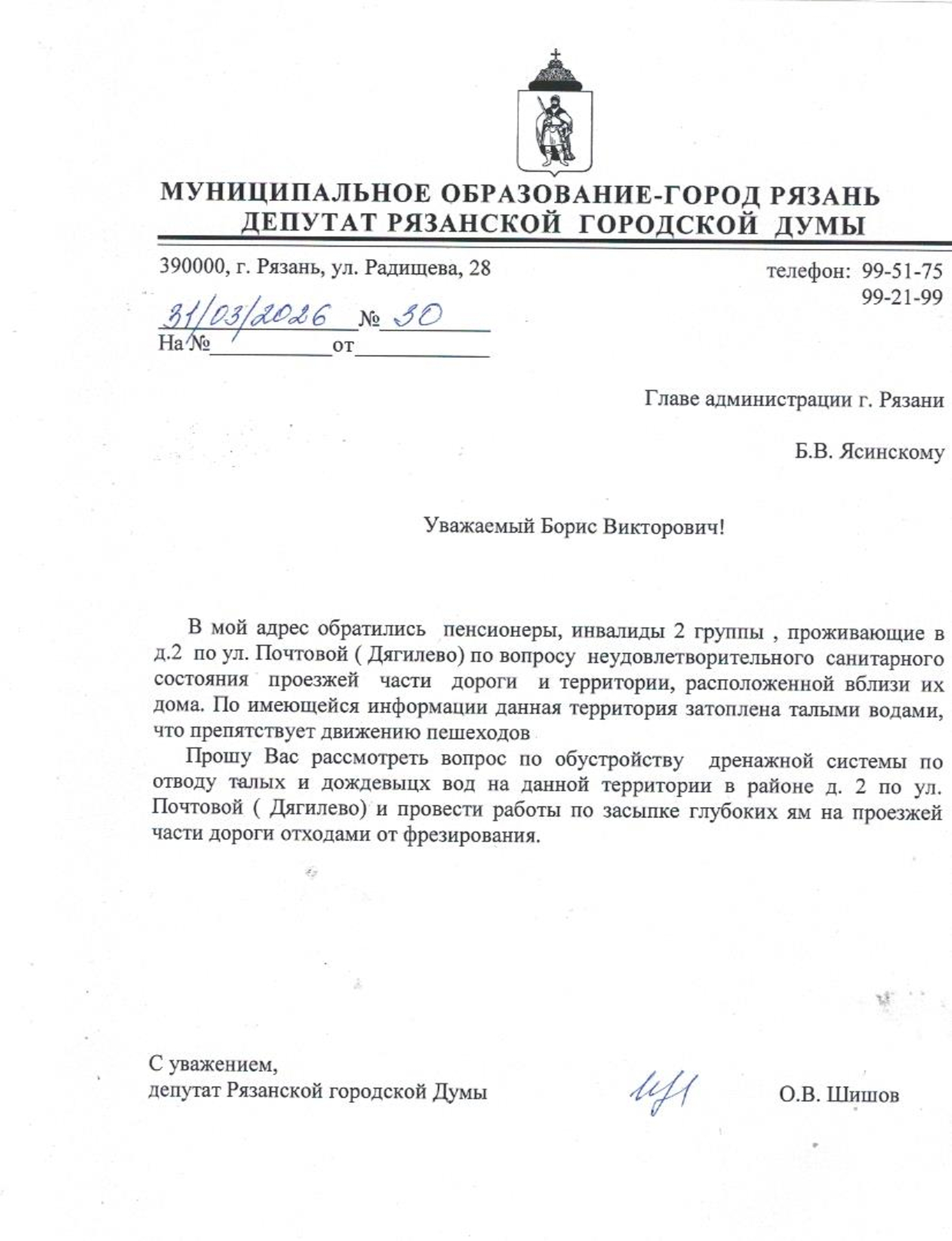 По итогам обращения из приёмной депутата Олега Шишова был отправлен официальный депутатский запрос в ответственные инстанции. В документе содержится просьба: обустроить дренажную систему для эффективного отвода талых и дождевых вод в районе дома №2 по улице Почтовой и провести ямочный ремонт проезжей части с использованием отходов от фрезирования для засыпки глубоких ям.