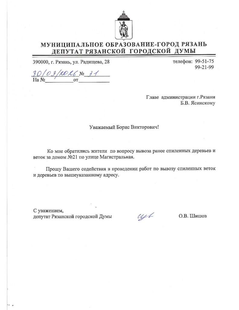 Недовольные жители микрорайона обратились за помощью к депутату городской думы Олегу Шишову. По их просьбе был незамедлительно подготовлен и направлен депутатский запрос в администрацию Рязани. В обращении содержится требование оперативно организовать вывоз спиленных деревьев и восстановить порядок на тротуаре.