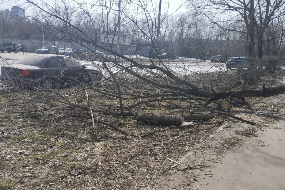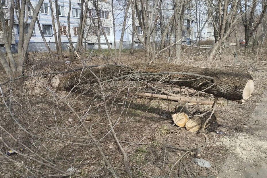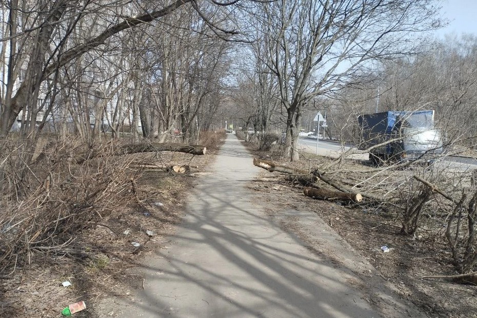 С приходом весны в Рязани обострились вопросы благоустройства. В микрорайоне Приокский, на улице Магистральная, дом 21, была проведена работа по спилу аварийных деревьев. Однако после завершения работ возникла новая проблема: спиленные ветки и стволы остались лежать на тротуаре.
