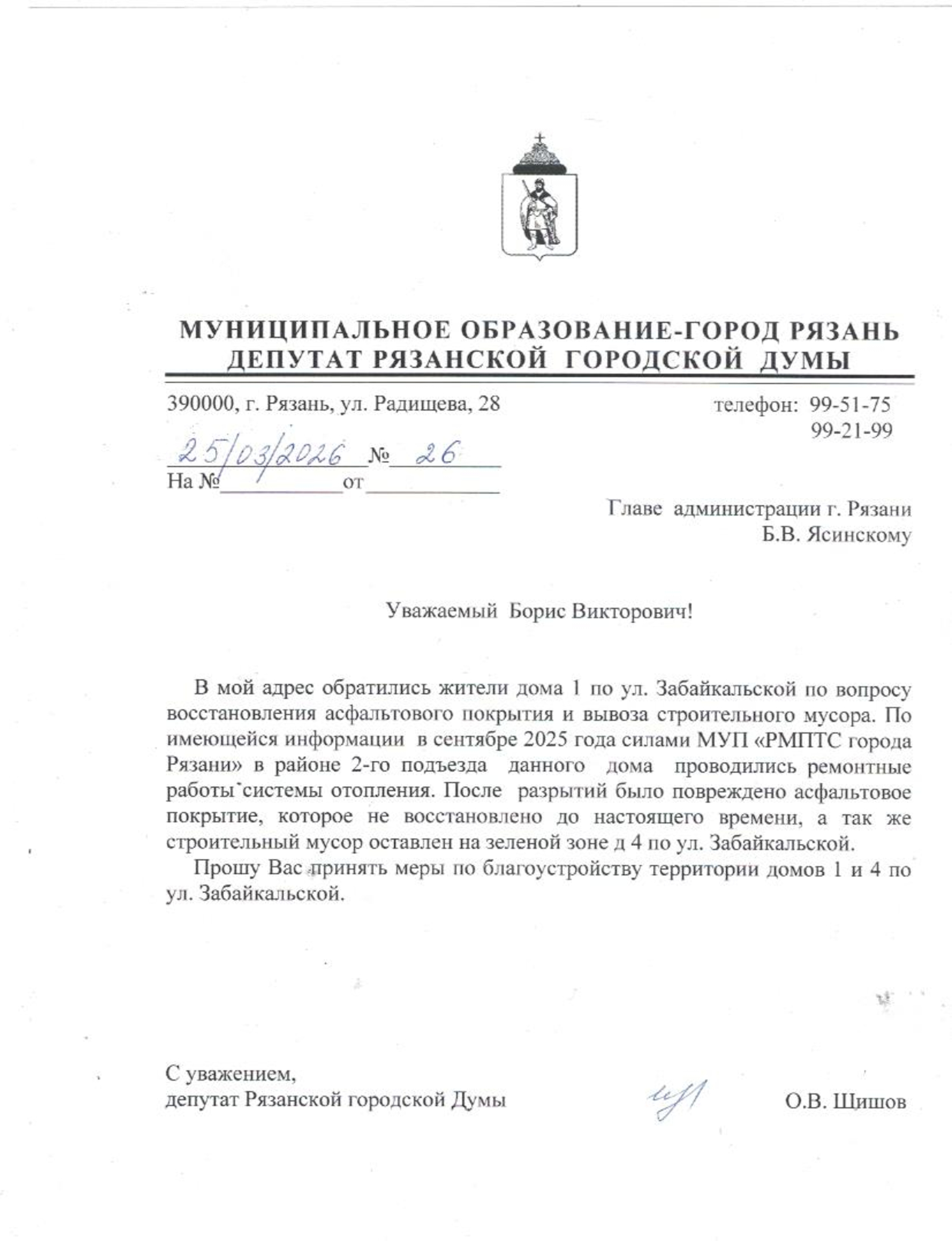 И вот жители снова обращаются к депутату. И снова в администрацию Рязани отправлен депутатский запрос с требованием ускорить благоустройство территории у домов №1 и №4 по улице Забайкальской. Горожане задаются вопросом: почему администрация не принимает кардинальных мер к должностным лицам РМПТС? Компания активно взимает плату за отопление и начисляет пени, но при этом игнорирует элементарные требования по восстановлению благоустройства. Работы были проведены в сентябре 2025 года, сейчас уже март 2026 года, а РМПТС так до сих пор не заасфальтировало яму и не вывезло мусор!